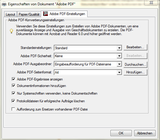Der Trick liegt in den Druckeinstellungen bzw. den Ausgabeeinstellungen des PDFs. Wählt man Drucken als Adobe PDF kann man im Druck-Dialog unter „Einstellungen“ oder „Druckereinstellungen“ (dort wo man für einen Drucker Farbe, Papierformat usw. definiert) auch die Einstellungen für das PDF ändern.